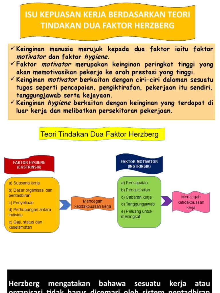 Beberapa teori yang menjelaskan masalah kepuasan kerja diuraikan sebagai berikut. Pencapaian prestasi achievement pengakuan prestasi recognition for accomplishment pekerjaan yang menantang challenging work tanggung jawab yang bertambah increased responsibility dan pertumbuhan serta perkembangan growth and. Berdasarkan penelitiannya ini Herzberg kemudian mengembangkan teori bahwa kepuasan kerja seseorang tergantung pada 2 jenis faktor yaitu Faktor kepuasan faktor motivator atau pemuas dan faktor ketidakpuasan faktor Hygiene atau ketidakpuasan yang kita kenal sebagai Teori Dua Faktor Herzberg.